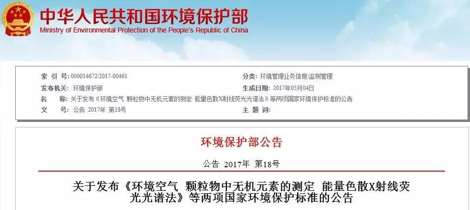 為貫徹《中華人民共和國(guó)環(huán)境保護(hù)法》和《中華人民共和國(guó)大氣污染防治法》,保護(hù)環(huán)境,保障人體健康,規(guī)范環(huán)境監(jiān)測(cè)工作,現(xiàn)批準(zhǔn)《環(huán)境空氣 顆粒物中無(wú)機(jī)元素的測(cè)定 能量色散X射線(xiàn)熒光光譜法》等兩項(xiàng)標(biāo)準(zhǔn)為國(guó)家環(huán)境保護(hù)標(biāo)準(zhǔn),并予發(fā)布。