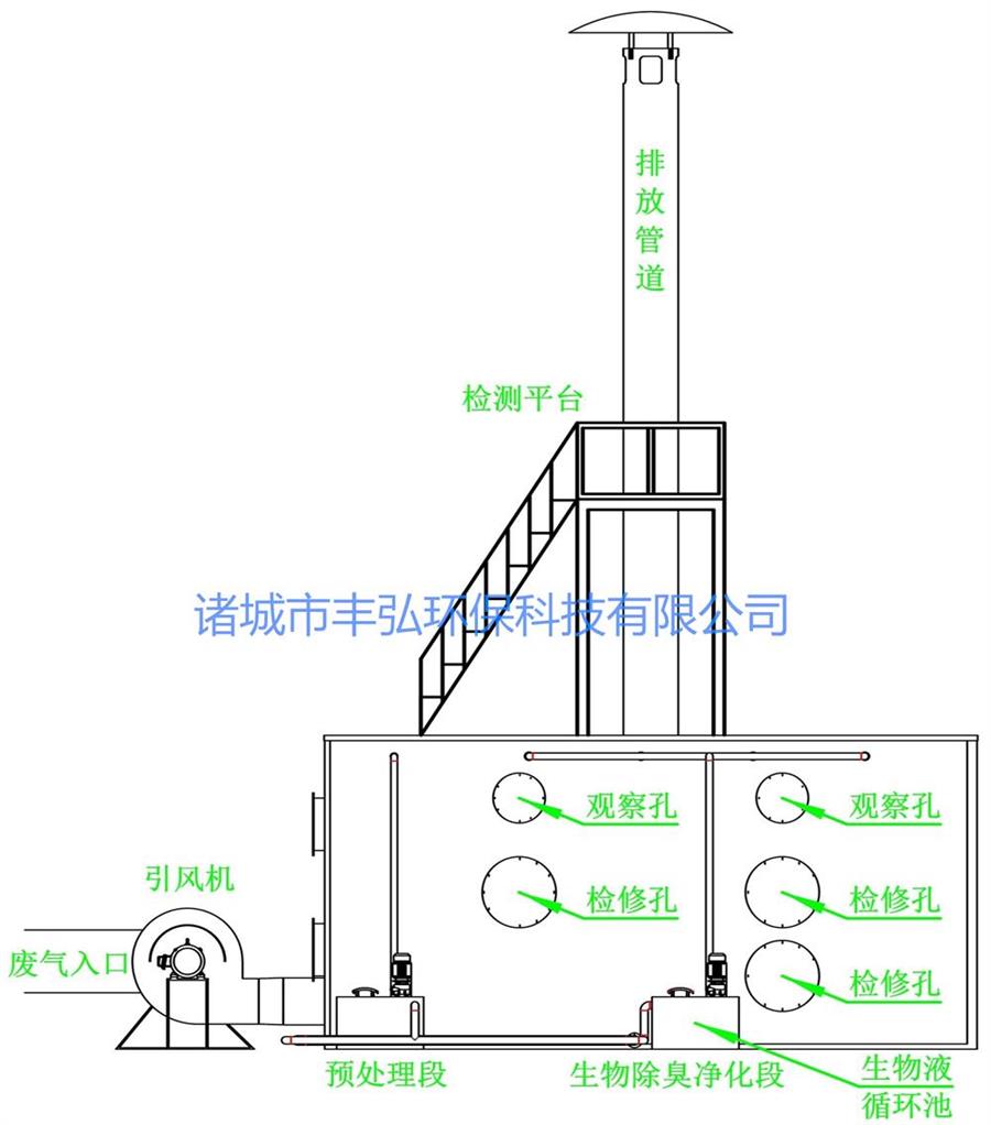 (3)進(jìn)入微生物細(xì)胞的惡臭成分子作為營(yíng)養(yǎng)物質(zhì)為微生物所分解、利用,從而使污染物得以去除。微生物除臭是利用微生物細(xì)胞對(duì)惡臭物質(zhì)的吸附、吸收和降解功能,對(duì)臭氣進(jìn)行處理的一種工藝。生物濾池廢氣臭氣處理主要過(guò)程如下:通過(guò)收集管道,抽風(fēng)機(jī)將臭氣收集到生物濾池除臭裝置,臭氣經(jīng)過(guò)加濕器進(jìn)行加濕后,進(jìn)入生物濾池池體,后經(jīng)過(guò)填料微生物的吸附、吸收和降解,將臭氣成分去除。